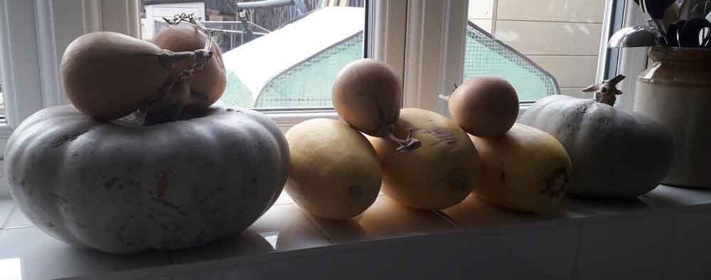 The results speak for themselves. Within our first year, we cropped salads, radishes, cucumbers, 130lb of potatoes, tomatoes, squash, courgettes, sweet corn, peas and beans, brussel sprouts, cabbages, carrots, onions, garlic, cauliflower, kale, spinach, blackberries, blackcurrants, raspberries, gooseberries and rhubarb. The photo at the top of this article is our kitchen window lined with some of the squash we harvested just a couple of months ago.